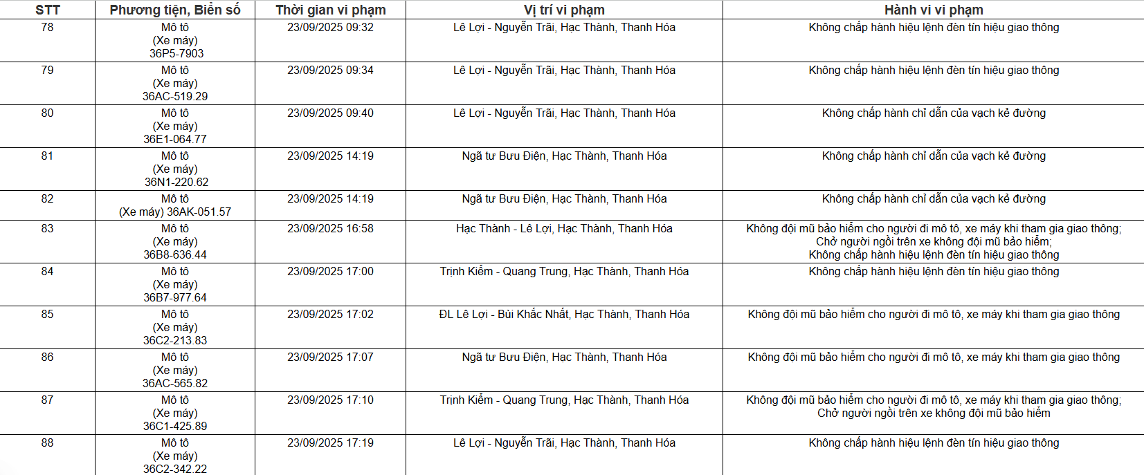 Danh sách được ghi nhận trên địa bàn tỉnh Thanh Hóa từ ngày 21/9 đến ngày 25/9, với hai lỗi phổ biến là không chấp hành hiệu lệnh của đèn tín hiệu giao thông và không đội mũ bảo hiểm.