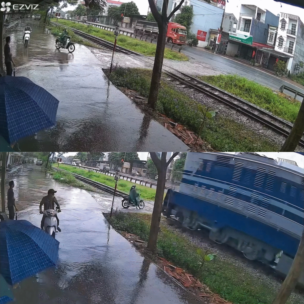 PHỐ TRÁNG – BẮC NINH SÁNG NAY Tiếng còi tàu rất lớn từ xa nhưng người đi xe máy mặc áo mưa dường như không nghe thấy nên sự việc đáng tiếc đã xảy ra. Mọi người ra đường trời mưa ra đường đi lại cẩn thận nhé
