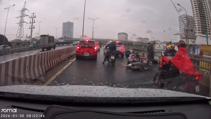 Sáng 30/1, trên cầu vượt Mai Dịch (Hà Nội) đã xảy ra tình huống giao thông nguy hiểm khi nhiều xe máy phanh gấp, trượt bánh và ngã liên hoàn do mặt đường trơn trượt sau mưa. Theo clip do người dân ghi lại, thời điểm xảy ra sự việc, khoảng 10 xe máy di […]
