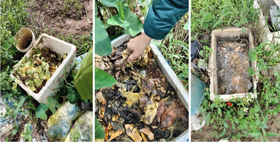 - Ngoài ra, một số hộ gia đình trồng rau ngắn ngày có sử dụng các rác thải hữu cơ để ủ phân bón, tuy nhiên các thùng ủ không được đậy kín nắp nên ghi nhận có rất nhiều ấu trùng của ruồi các tuổi trong tất cả các thùng ủ. Các thùng được ghi nhận ở các ruộng ngay gần với trường học.