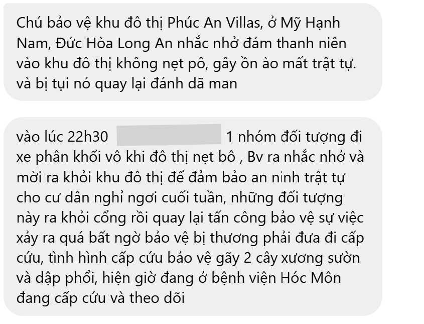 Phát hiện sự việc, anh Nguyễn Hữu Thắng (47 tuổi, nhân viên bảo vệ) ra nhắc nhở và yêu cầu nhóm thanh niên rời đi. Tuy nhiên, nhóm này không chấp hành mà quay lại truy đuổi, bao vây, dùng nón bảo hiểm và tay chân đánh anh Thắng nhiều lần rồi bỏ trốn.