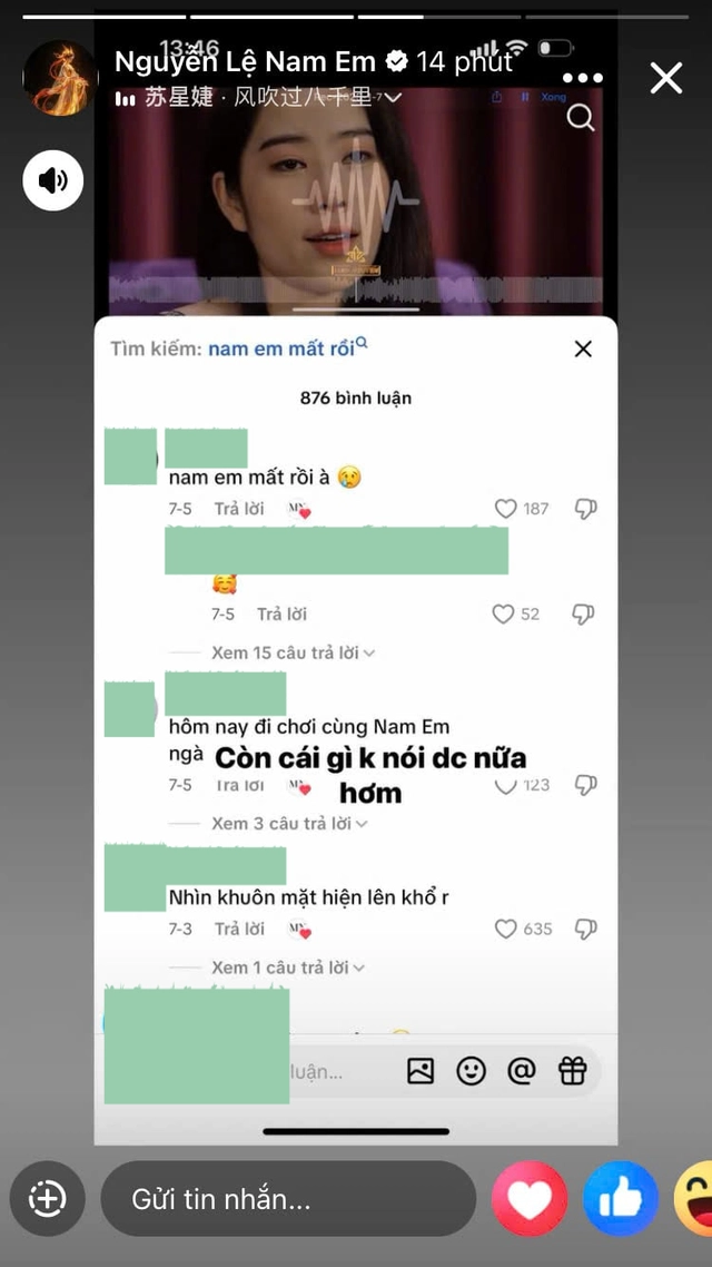 Mới đây, Nam Em đã đăng trên story một tin đồn vô căn cứ về mình. Mỹ nhân quê Tiền Giang bày tỏ ngán ngẩm khi biết trên mạng xã hội đang lan truyền thông tin cô đã qua đời. Cô viết: “Còn cái gì không nói được nữa không”.