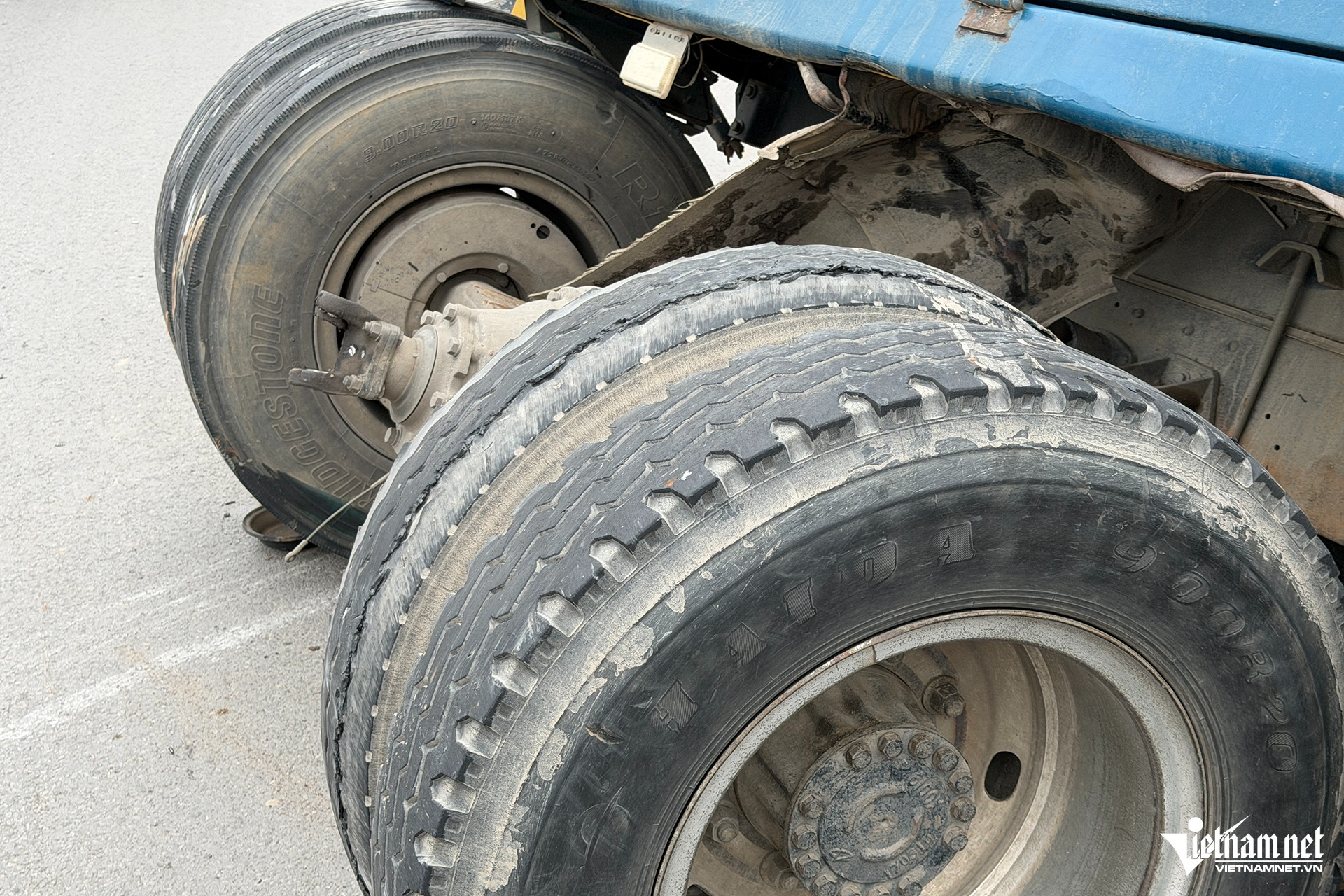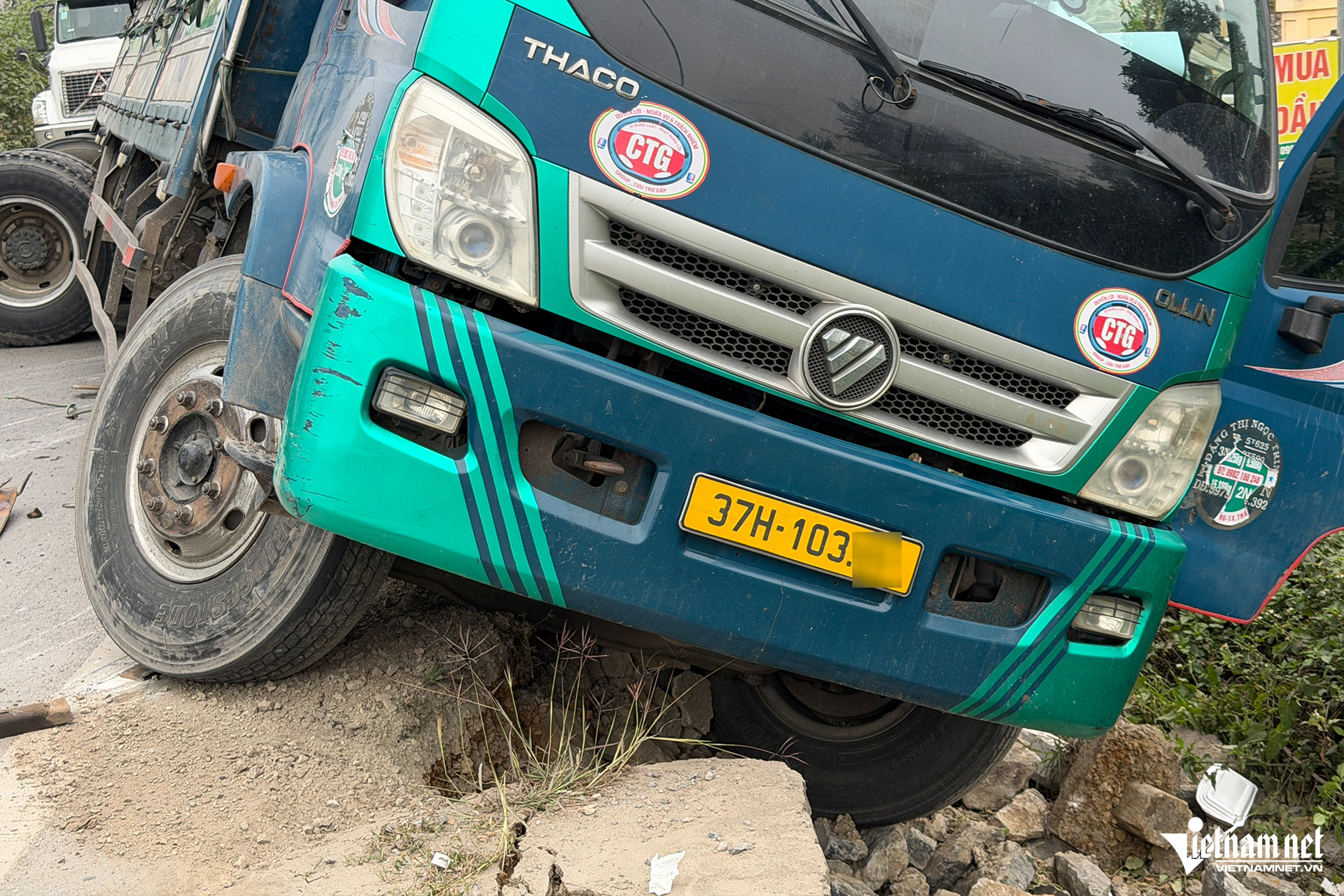 Tại hiện trường, ô tô tải bị hư hỏng nặng, bung trục phía sau, phần đầu xe nằm dưới vệ đường. Rất may, tài xế xe tải không bị thương.
