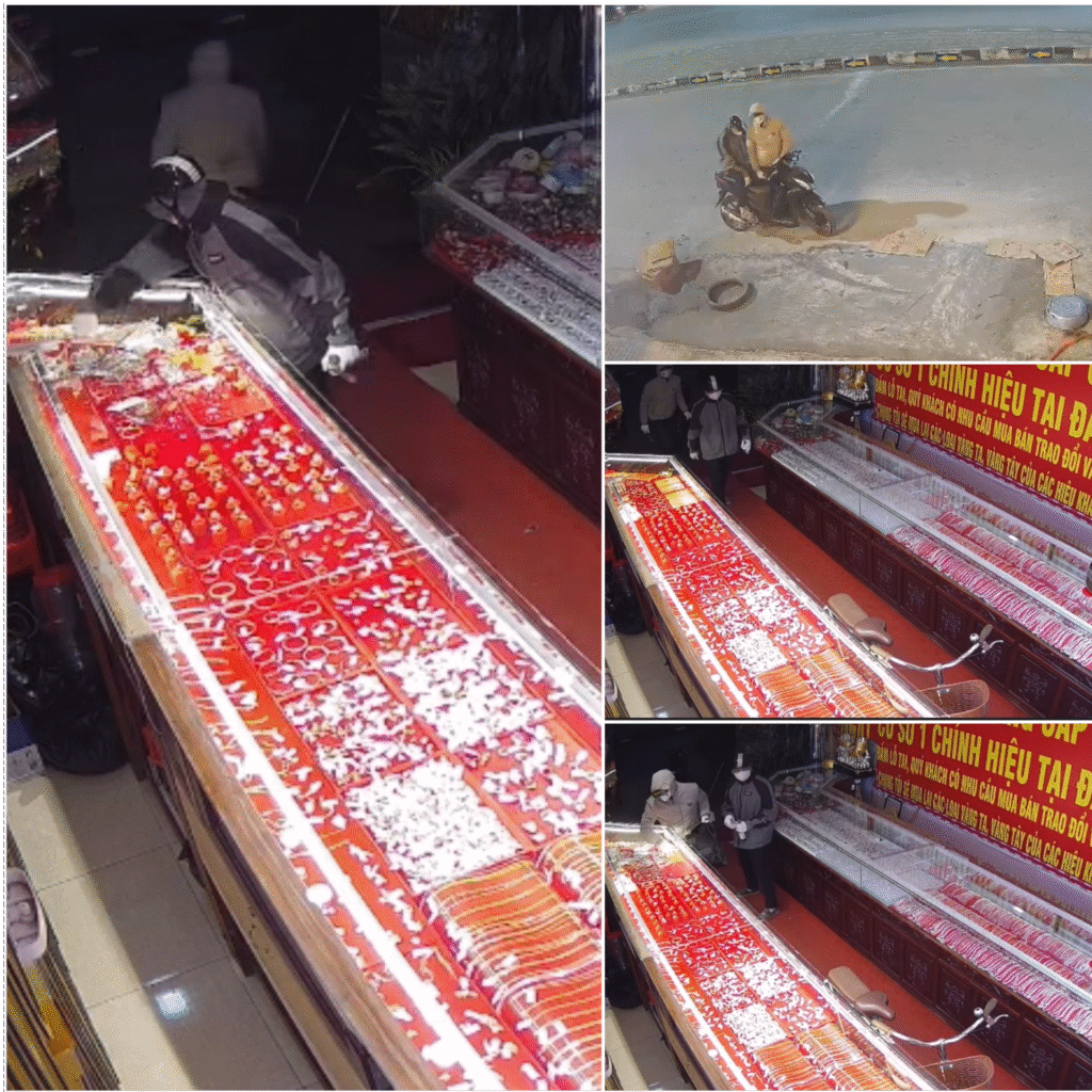 Hai người đi xe máy đeo khẩu trang kín mít,1 người đi trước mang theo…., 1 người đi sau cầm vật dụng vào tiệm vàng phá tủ rồi vơ liên tục cho vào balo vào đêm qua