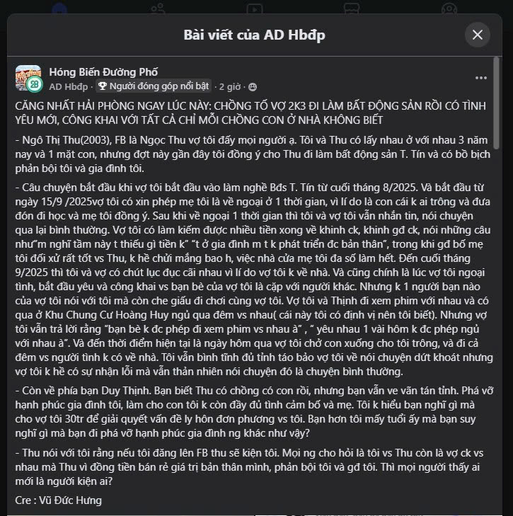Mới đây, mạng xã hội xôn xao trước bài đăng của tài khoản Vũ Đức Hưng, tự nhận là chồng của Ngô Thị Thu (SN 2003, quê Hải Phòng), người anh cho biết “đang làm nghề bất động sản tại công ty T. Tín”. Theo nội dung chia sẻ, anh Hưng tố vợ mình “thay đổi hoàn toàn” sau khi đi làm, có quan hệ tình cảm với người khác, thậm chí công khai mối quan hệ này với bạn bè nhưng giấu chồng và con nhỏ ở nhà.