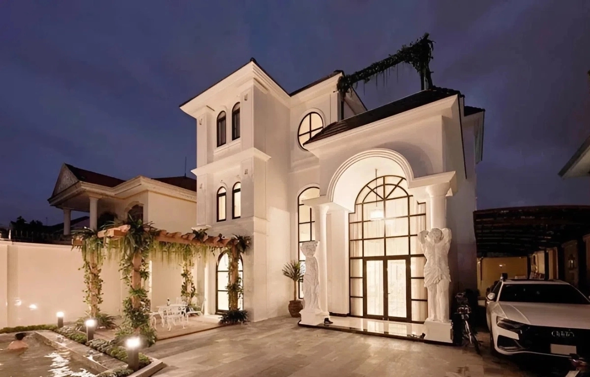 Ngôi nhà có tông màu trắng chủ đạo, gồm một trệt và hai lầu. Phía trước nhà, nữ ca sĩ đặt hai tượng đá nam thần, nữ thần mang lại cảm giác như bước vào lâu đài Hy Lạp. Các chi tiết cầu thang xoắn dát vàng, đèn Baikal tiền tỷ, bàn ăn đá hoa cương và nhiều bức tượng nghệ thuật cũng được chăm chút từng chi tiết.