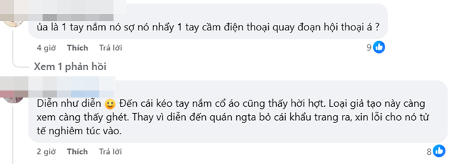 ‘Diễn như diễn, đến cái kéo tay nắm cổ áo cũng thấy hời hợt. Loại giả tạo này càng xem càng thấy ghét. Thay vì diễn đến quán người ta bỏ cái khẩu trang ra, xin lỗi cho nó tử tế, nghiêm túc vào’