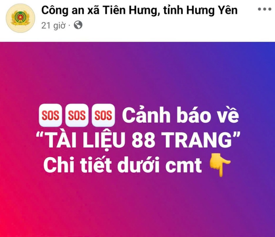phát tán trên mạng xã hội. Fanpage của công an xã Tiên Hưng thông tin hiện nay, một số tài liệu (như “Tài liệu 88 trang”…) có nội dung kích động, nội dung cực kỳ độc hại, gây hoang mang và vi phạm pháp luật nghiêm trọng.