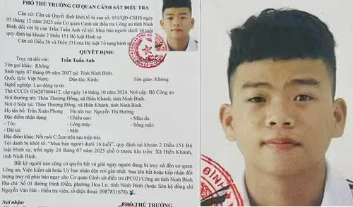 Cơ quan Cảnh sát điều tra Công an tỉnh Ninh Bình vừa ban hành quyết định truy nã đặc biệt đối với Trần Tuấn Anh (SN 2007, lao động tự do) để phục vụ công tác điều tra về hành vi Mua bán người dưới 16 tuổi.