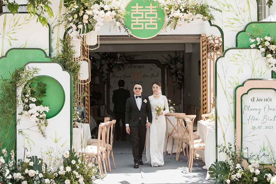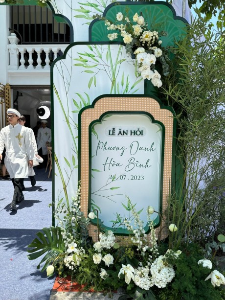 Theo chia sẻ của ê-kíp, Phương Oanh là người đưa ra ý tưởng trang trí lễ ăn hỏi bằng trúc và sen. Đây cũng là loài hoa diễn viên rất yêu thích, thường cắm mỗi mùa hè.