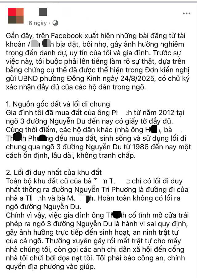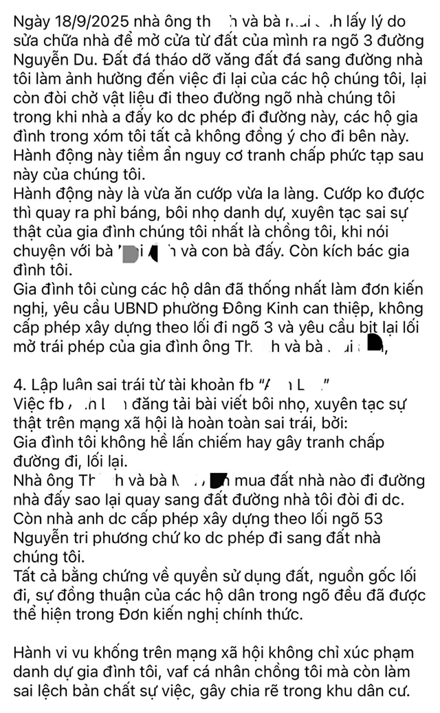 Trước đó, vào ngày 19/9, người phụ nữ này cũng từng đăng tải bài viết phân trần, cho rằng mình bị vu khống, đồng thời đưa ra Đơn kiến nghị gửi UBND phường Đông Kinh (có chữ ký của nhiều hộ dân trong ngõ 3 Nguyễn Du) để làm rõ nguồn gốc đất và lối đi chung. Bà cho biết đã nhiều lần phản ánh việc một số hộ dân mở cửa trái phép ra ngõ 3 Nguyễn Du, đưa vật liệu xây dựng vào, gây ảnh hưởng đến sinh hoạt và an ninh trật tự.