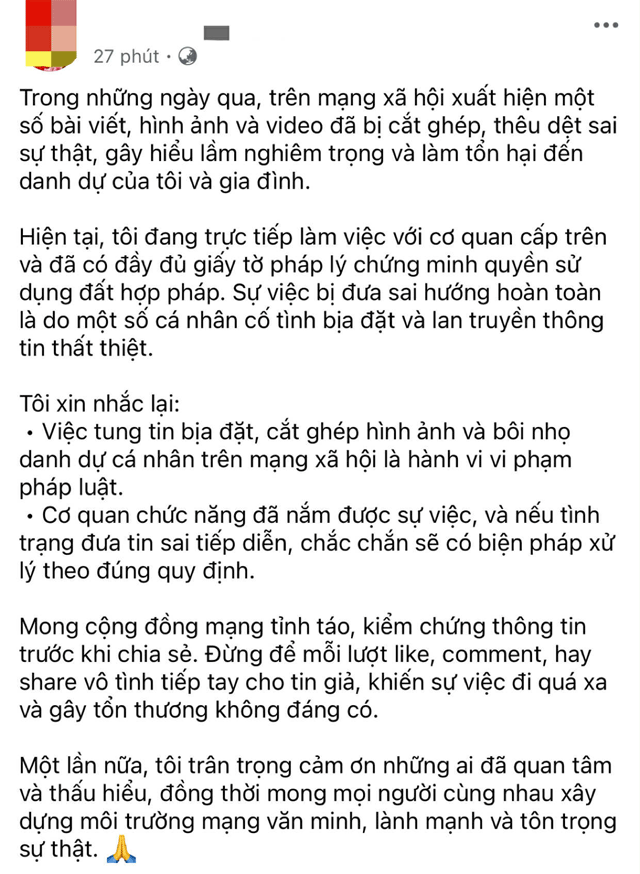 Người phụ nữ cho biết: “Những bài viết, hình ảnh, video cắt ghép sai sự thật đã gây tổn hại đến danh dự cá nhân và gia đình tôi. Việc tung tin bịa đặt, bôi nhọ trên mạng là hành vi vi phạm pháp luật. Tôi đề nghị mọi người kiểm chứng thông tin trước khi chia sẻ, tránh tiếp tay cho tin giả”.