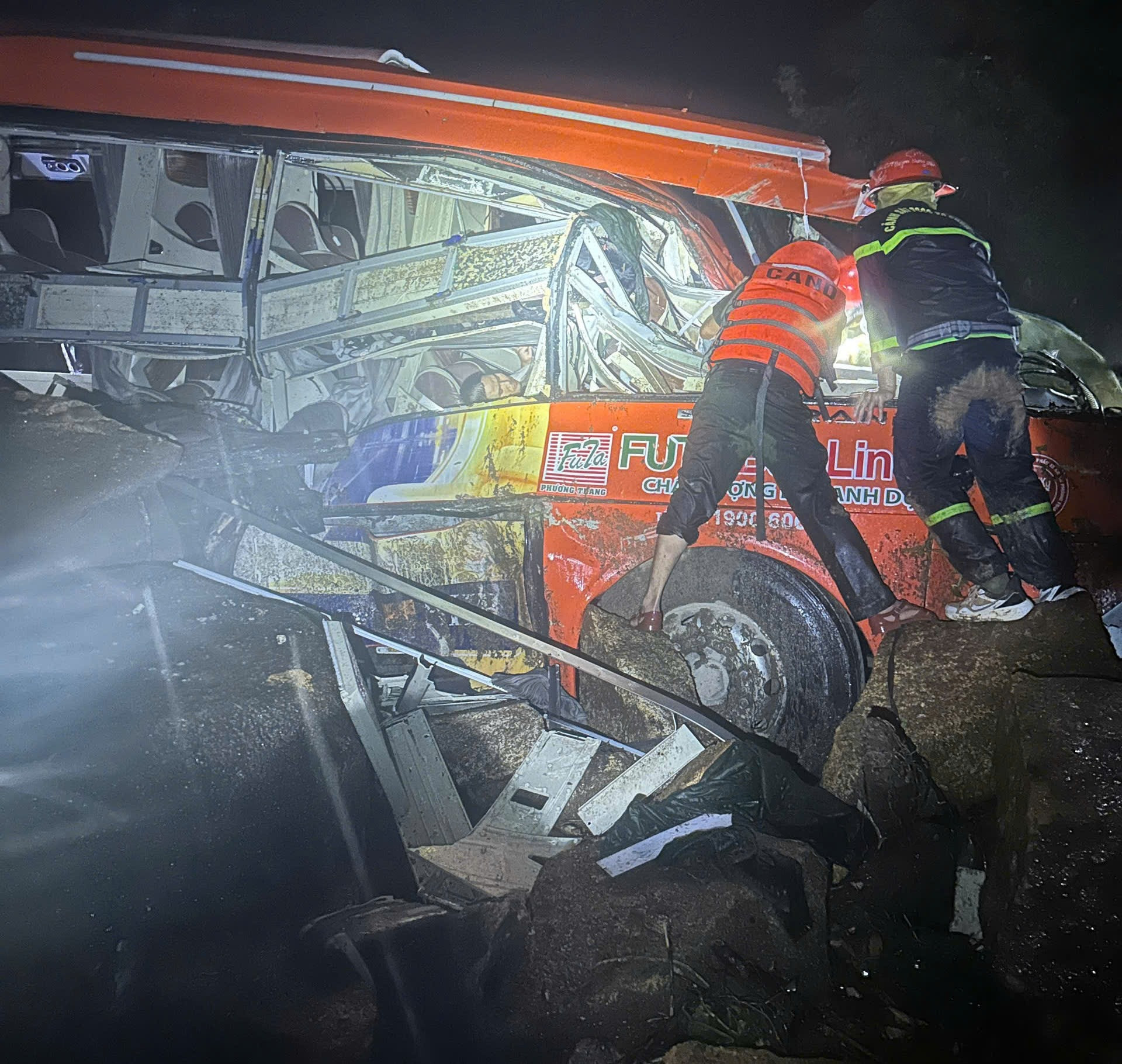 Lúc này, đá tảng lớn và đất cát từ trên núi đổ xuống ô tô khách. Lượng lớn đất đá làm phần cabin ô tô tách rời. Thân xe bị đá từ trên cao làm biến dạng, vỡ kính. Nhiều người mắc kẹt trong xe.