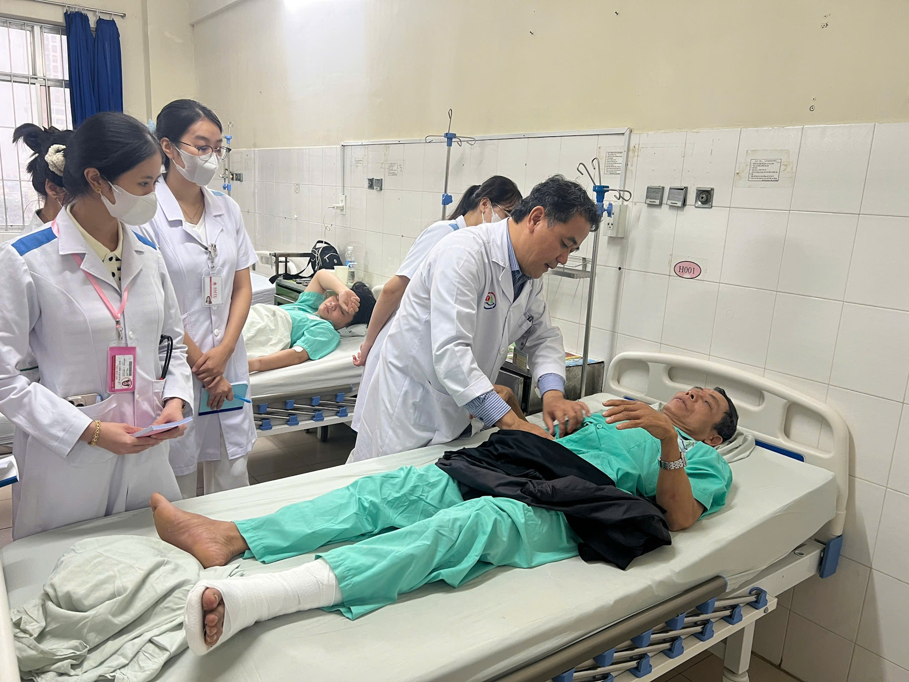 Bác sĩ kiểm tra sức khoẻ các bệnh nhân bị thương trong vụ sạt lở đất đá đè ô tô khách trên đèo Khánh Lê. Ảnh: XN