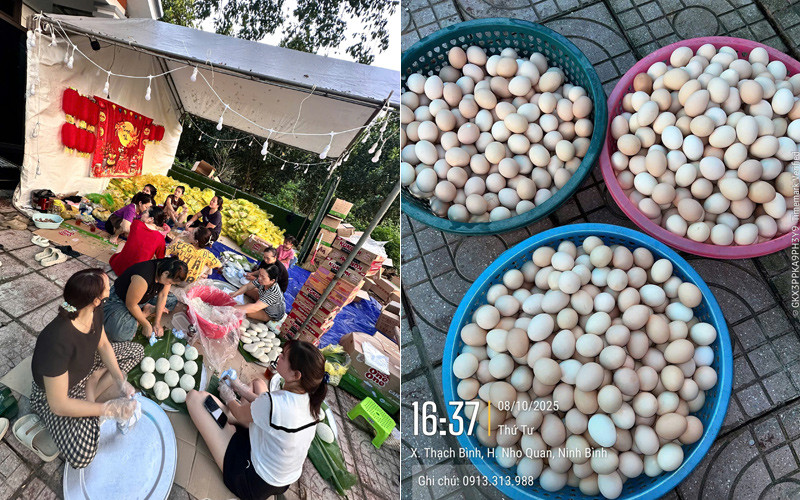 13h ngày 8/10, khoảng 30 người tập trung tại nhà của một hộ dân trong xã Phú Sơn, cùng nhau nấu nướng. Nhóm chị Trang làm ruốc, luộc 1.200 quả trứng, làm cơm nắm… rồi gói ghém cẩn thận để gửi đến bà con vùng ngập.
