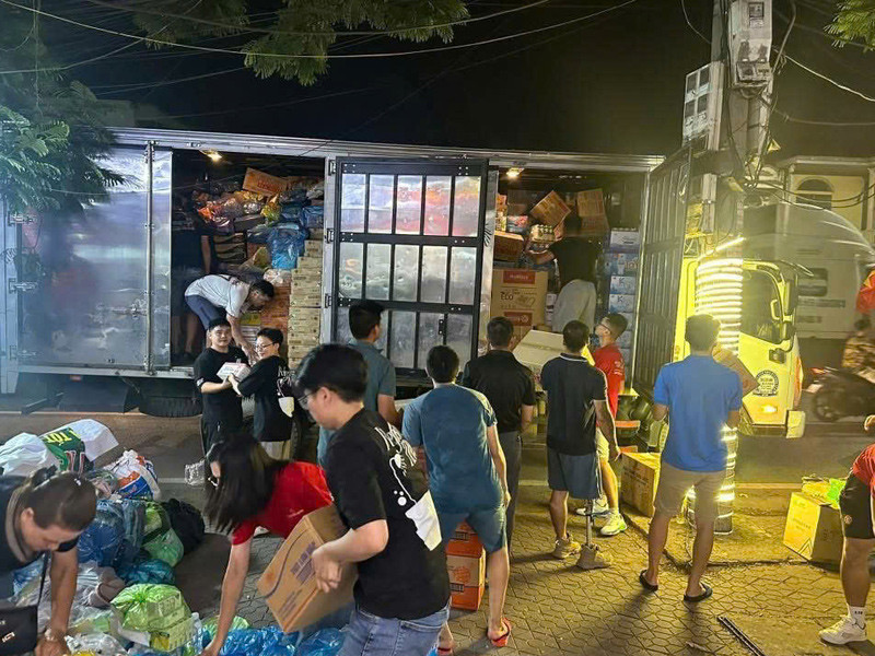 Người dân chung tay xếp nhu yếu phẩm lên xe cứu trợ