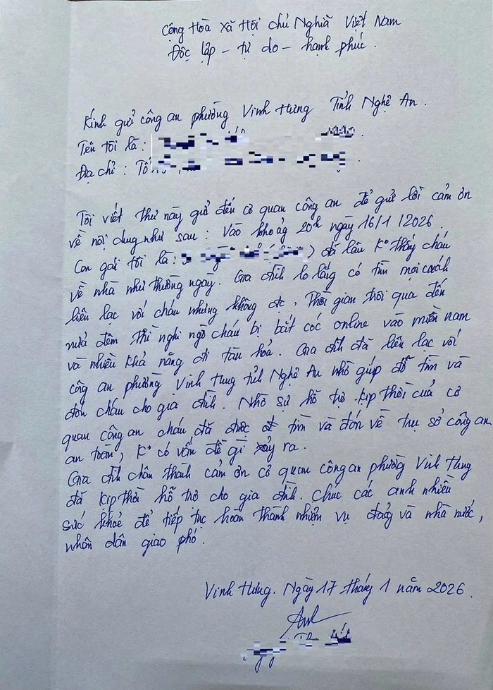 Sau đó, Công an phường đã liên hệ với gia đình để đón em L.T.A. về nhà. Gia đình nạn nhân đã gửi thư cảm ơn lực lượng Công an phường Vinh Hưng vì sự vào cuộc nhanh chóng, kịp thời.