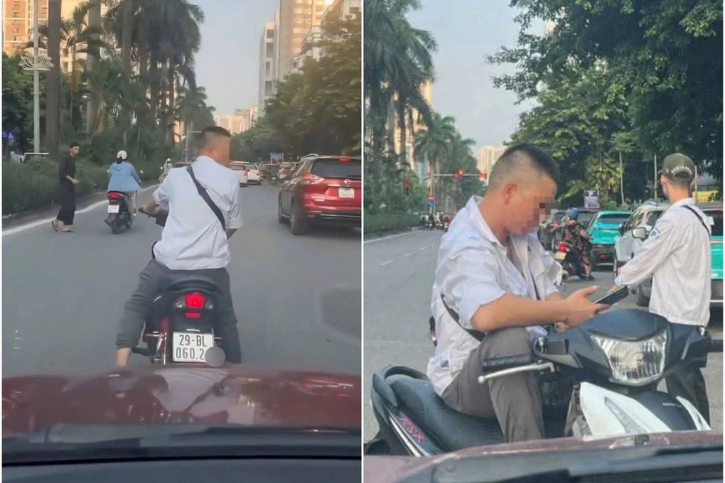 Đáng nói, người đi máy không đội mũ bảo hiểm, khi chặn đầu ô tô thì ngang nhiên đỗ xe máy để dùng điện thoại. Hành động trên không chỉ gây cản trở tài xế ô tô mà còn gây ách tắc giao thông.