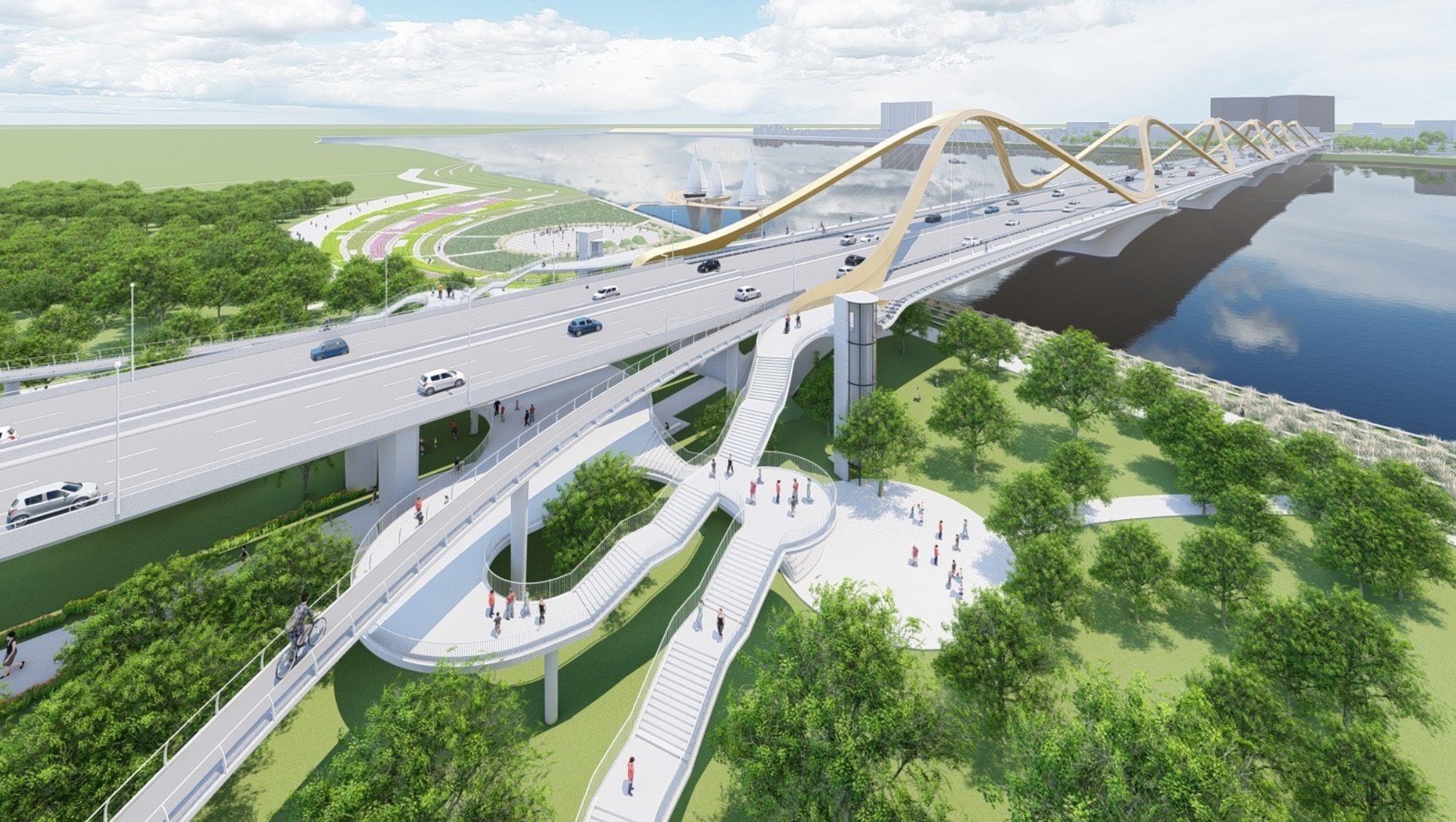 Phối cảnh cầu Trần Hưng Đạo bắc qua sông Hồng.