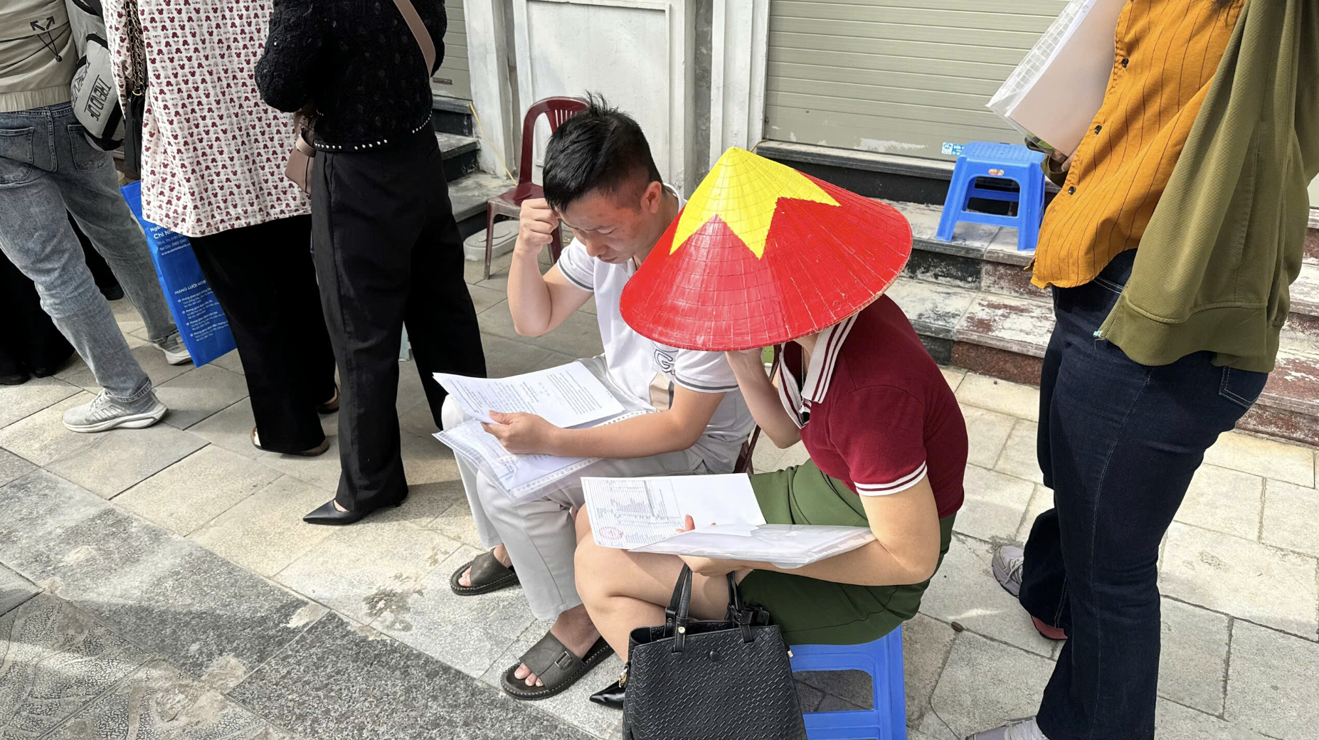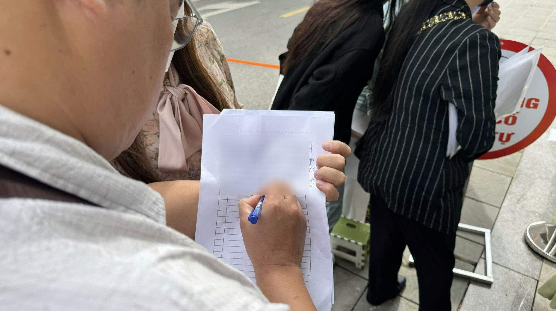 Người dân tranh thủ ngồi ghi chép, hoàn thiện hồ sơ ngay tại chỗ. Ảnh: Anh Văn