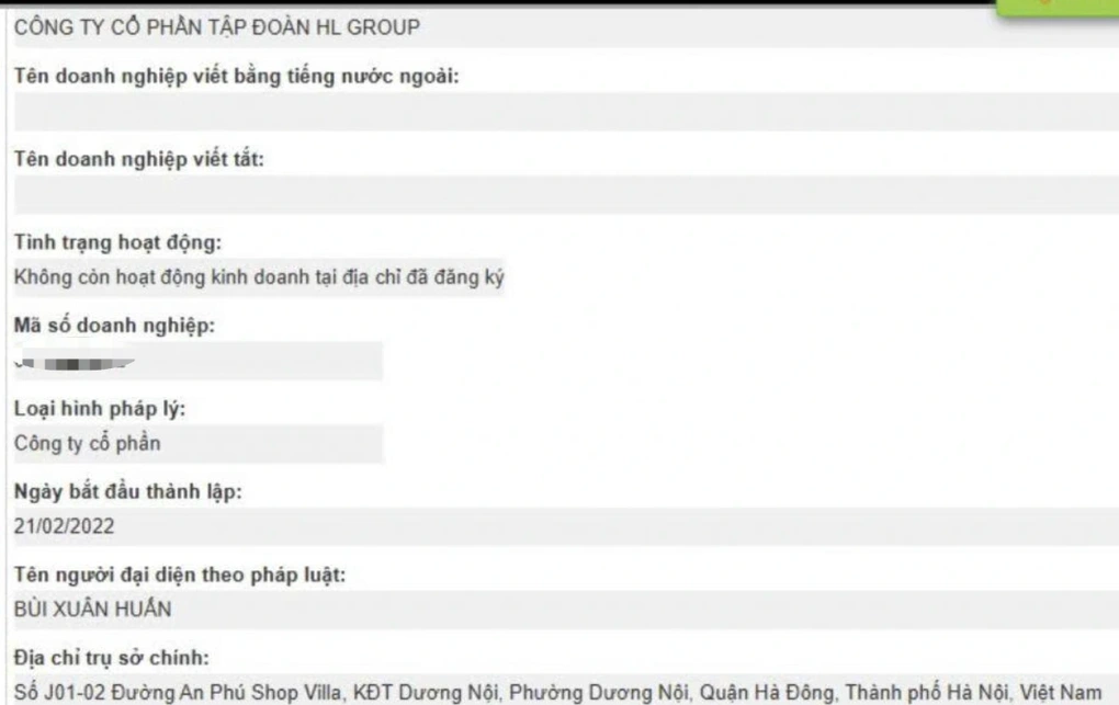 Theo dữ liệu từ Cổng thông tin quốc gia về đăng ký doanh nghiệp, Công ty Cổ phần Tập đoàn HL Group – được xem là “đầu tàu” trong hệ sinh thái của Huấn “Hoa Hồng” – được thành lập tháng 2/2022, trụ sở tại khu đô thị Dương Nội (Hà Nội), vốn điều lệ gần 100 tỷ đồng.