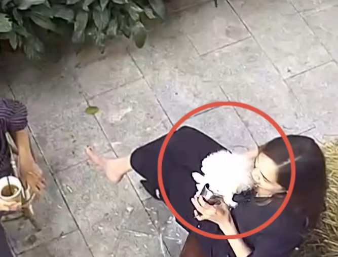Vị khách nữ áo đen dùng cốc inox vốn dành cho người, để chó cưng uống nước trực tiếp (Ảnh: Nhân vật cung cấp).