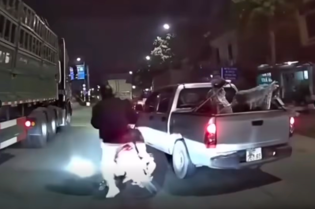 Vị trí người đi xe máy ngã ra đường rất gần gầm xe tải đi cùng chiều nhưng rất may họ không bị xe tải cán trúng. Sau đó, người đàn ông điều khiển xe máy nhanh chóng bế em bé và cố gắng chạy bộ đuổi theo chiếc bán tải nhưng bất thành.