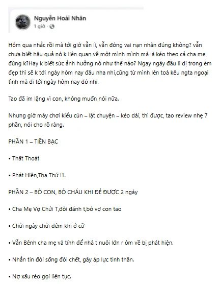 Một bài đăng từ tài khoản mạng xã hội Facebook có tên viết tắt NHN đang thu hút nhiều sự quan tâm của cộng đồng mạng khi phản ánh những mâu thuẫn xoay quanh đời sống hôn nhân, quá trình giải quyết ly hôn và các tranh cãi phát sinh liên quan đến người thứ ba.
