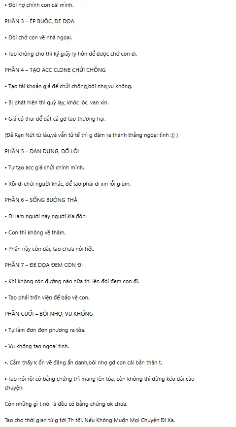 Theo nội dung bài chia sẻ, người đăng cho biết bản thân và người phụ nữ tên Nhi hiện vẫn là vợ chồng hợp pháp trên giấy tờ, chưa hoàn tất thủ tục ly hôn theo quy định pháp luật. Hai người có chung một con nhỏ. Khi con được khoảng 7 tháng tuổi, người vợ đi làm và sau đó không trở về nhà, đến nay con gần 15 tháng tuổi nhưng hai bên vẫn sống ly thân.