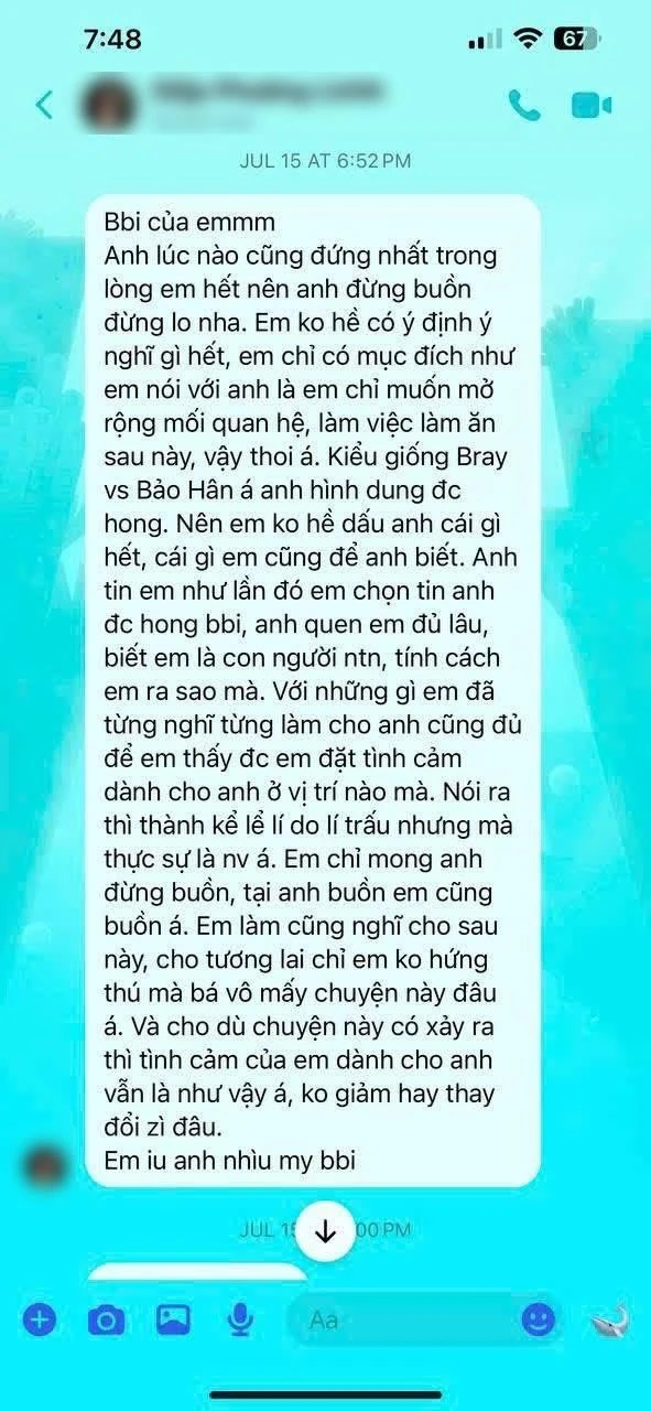 Chủ tài khoản trên còn đăng tải đoạn clip ghi âm cuộc trò chuyện của mình với bạn gái D.P.L. để chất vấn về chuyện của cô với nam rapper tham gia “Anh trai say hi”. Hot girl vẫn khẳng định đôi bên không làm chuyện gì có lỗi với người yêu. Tuy nhiên, trước những lời “hỏi tội” của chủ tài khoản, cô không đưa ra được lời giải thích hợp lý.