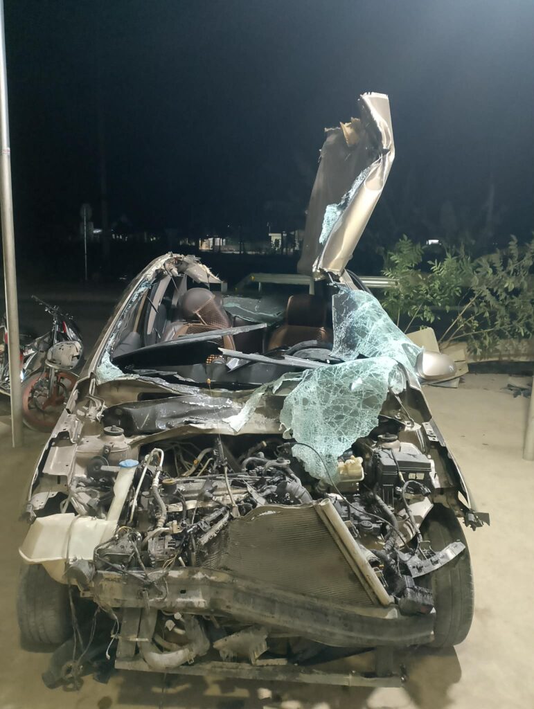 Cú va chạm mạnh khiến chiếc xe ô tô bị biến dạng nghiêm trọng, phần đầu xe hư hỏng nặng. Ngay sau tai nạn, một người đàn ông từ trong xe bước ra ngoài trong tình trạng không bị thương tích, trên tay vẫn cầm điện thoại.