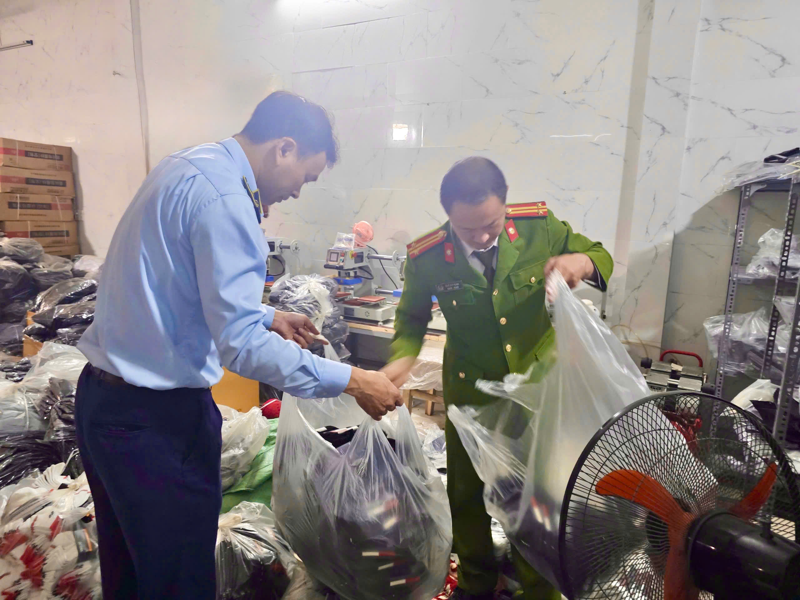 Quá trình kiểm tra cho thấy, tại cơ sở đang có một số hàng hóa là bít tất trong quá trình sản xuất có dấu hiệu giả mạo các nhãn hiệu “PUMA”, “TOMMY HILFIGER” và “YONEX”. Đoàn kiểm tra đã báo cáo lãnh đạo và tiến hành tạm giữ, niêm phong toàn bộ số hàng hóa, máy móc và tem mác liên quan để xác minh, làm rõ và xử lý theo quy định.