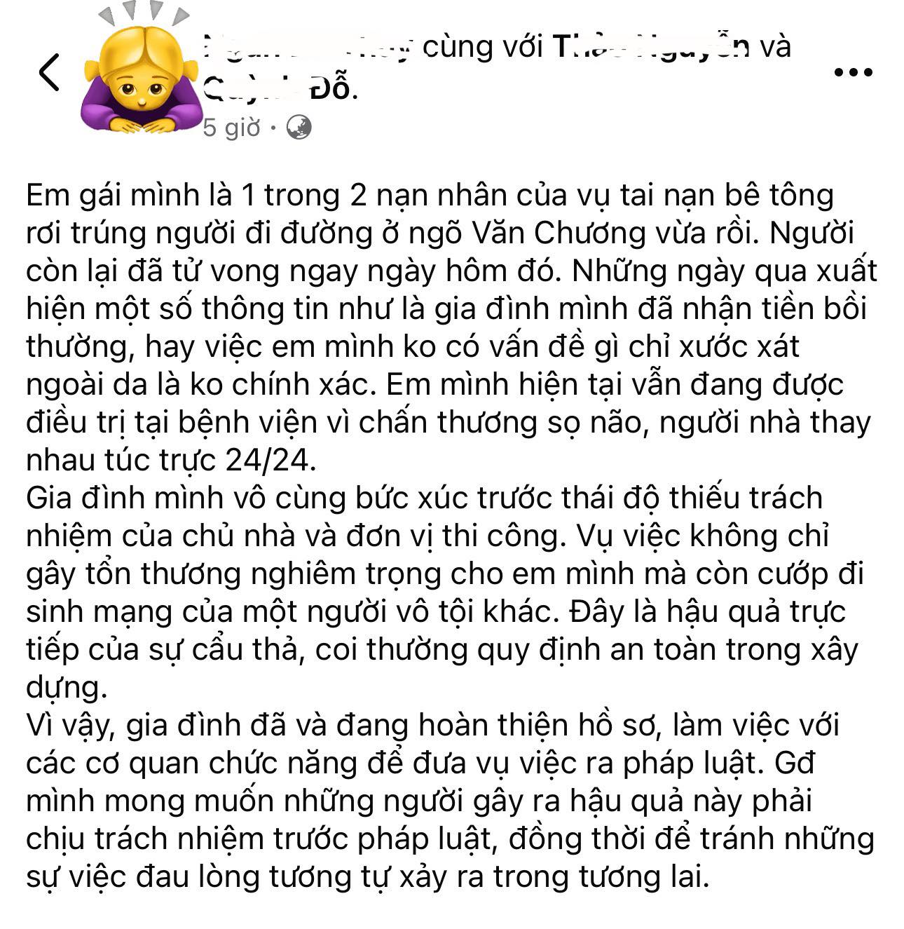 Trước đó, vào thời điểm xảy ra vụ việc, người dân khu vực đầu ngõ Văn Chương nghe thấy tiếng động lớn, chạy ra kiểm tra thì thấy một người đàn ông nằm bất tỉnh, bị tấm bê tông đè lên người, cạnh đó là chiếc xe máy.