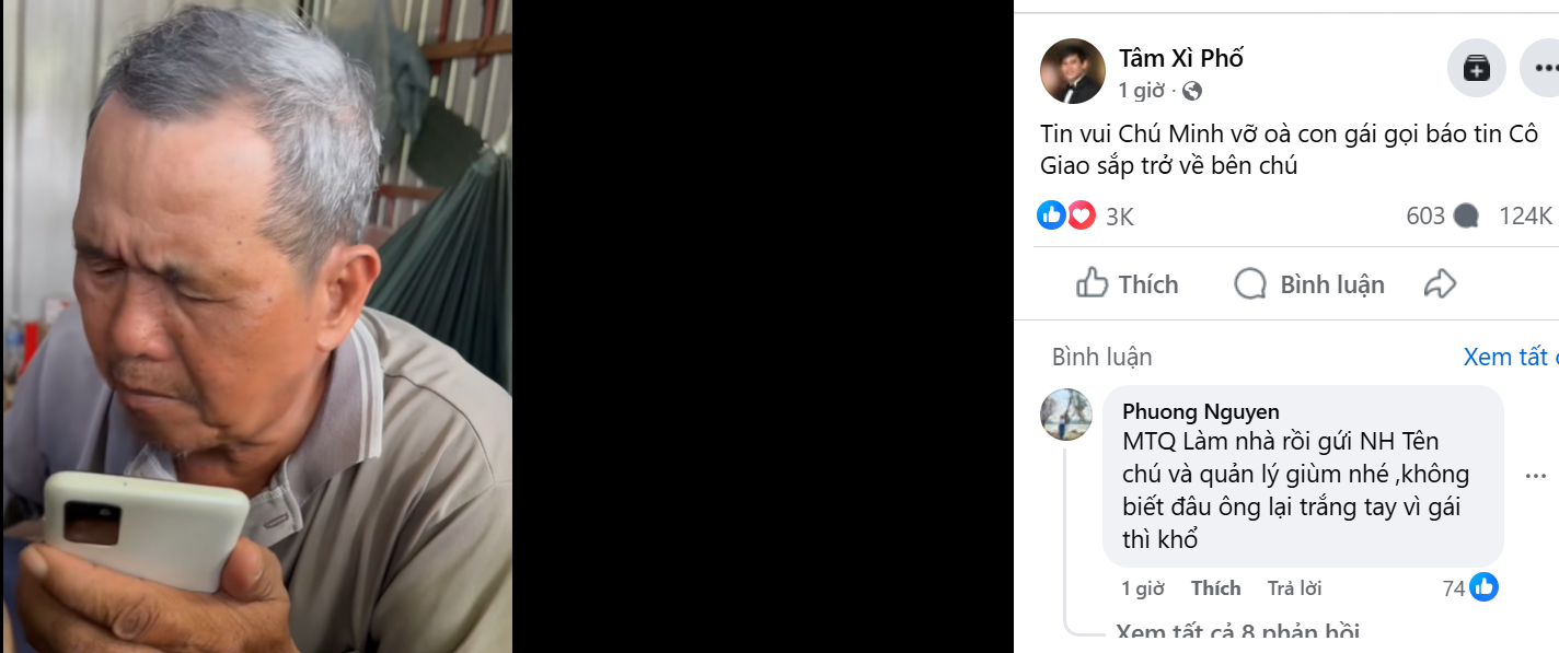 Mới đây, chú Minh đã nhận được cuộc điện thoại từ con gái cô Giao (với người chồng 2) nói rằng cô Giao sẽ sớm trở về với chú. Cụ thể, người này cho biết cô Giao từng gọi cho con gái và kể ‘về nhà coi sao’. Ngay sau khi nhận được thông tin này, chú Giao vô cùng phấn khởi, không giấu được niềm vui.