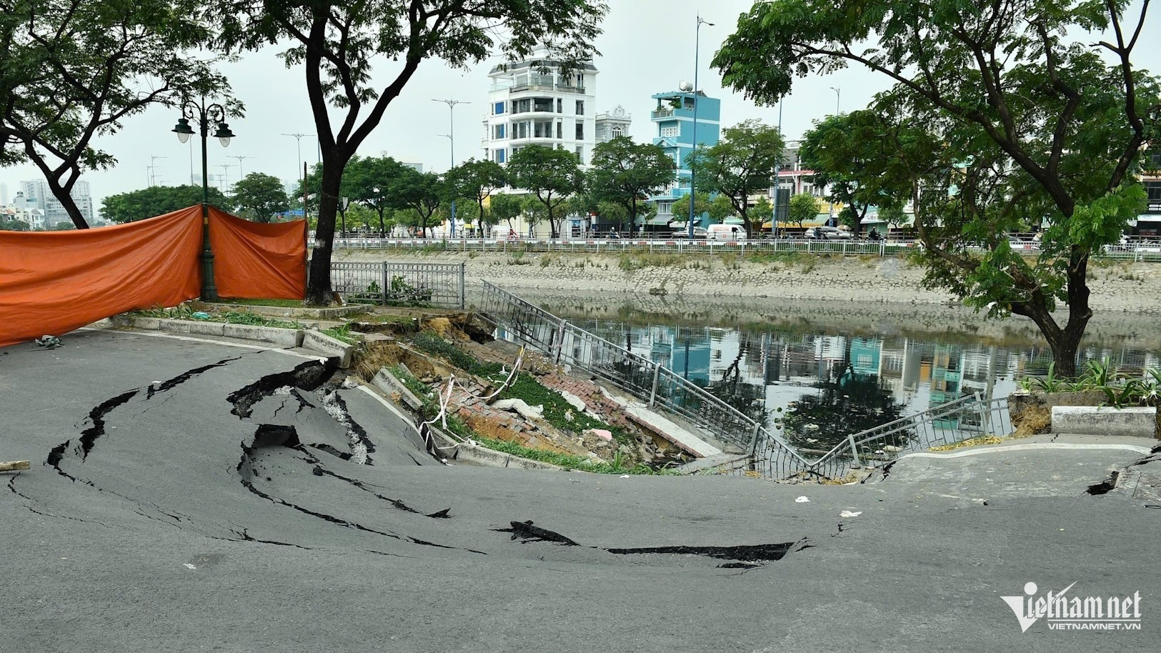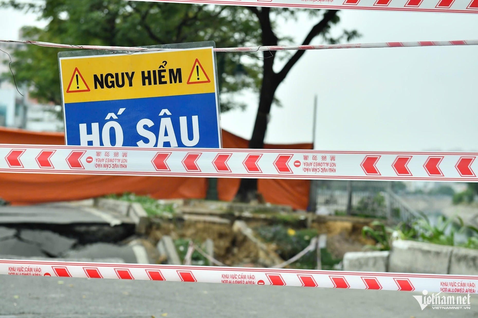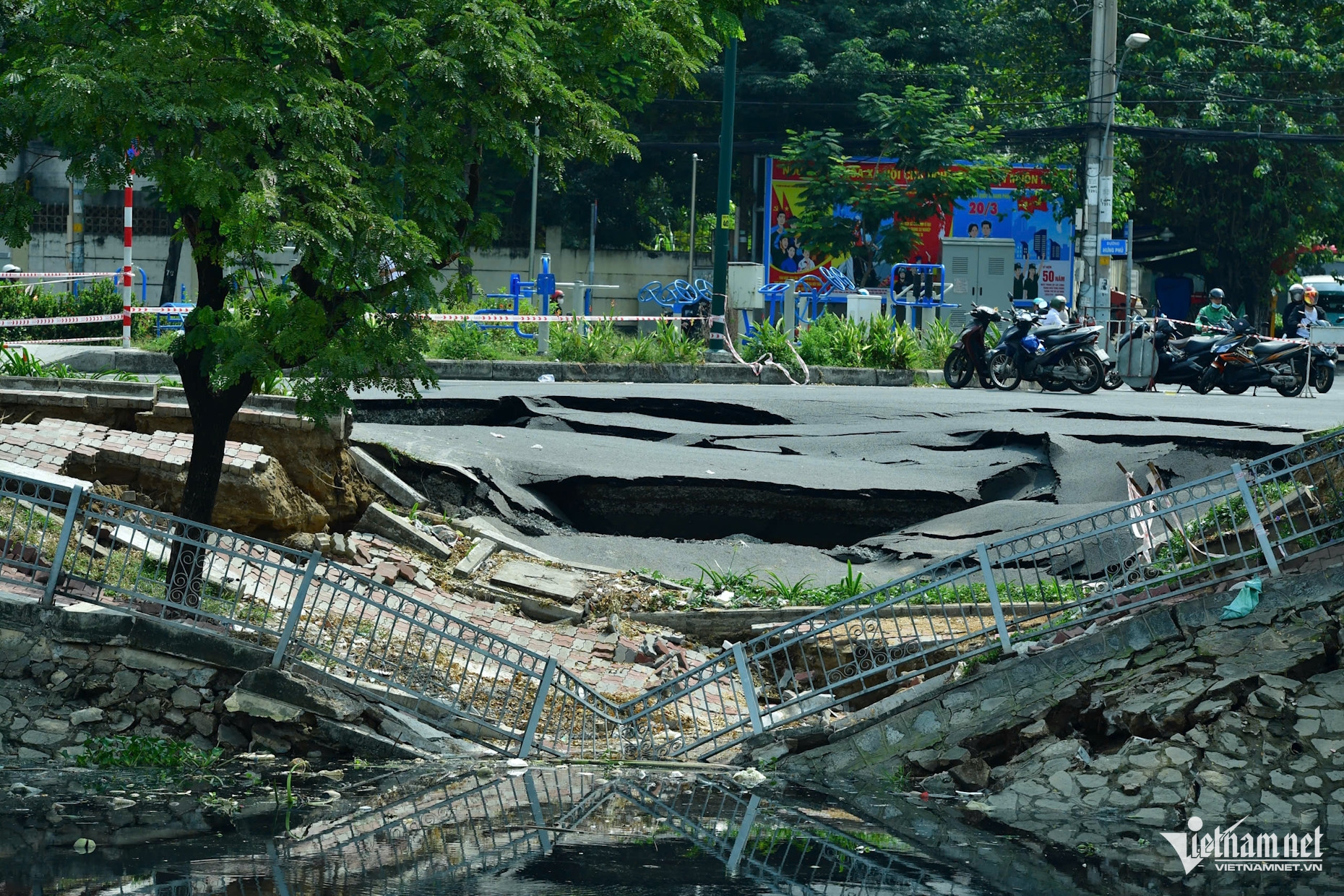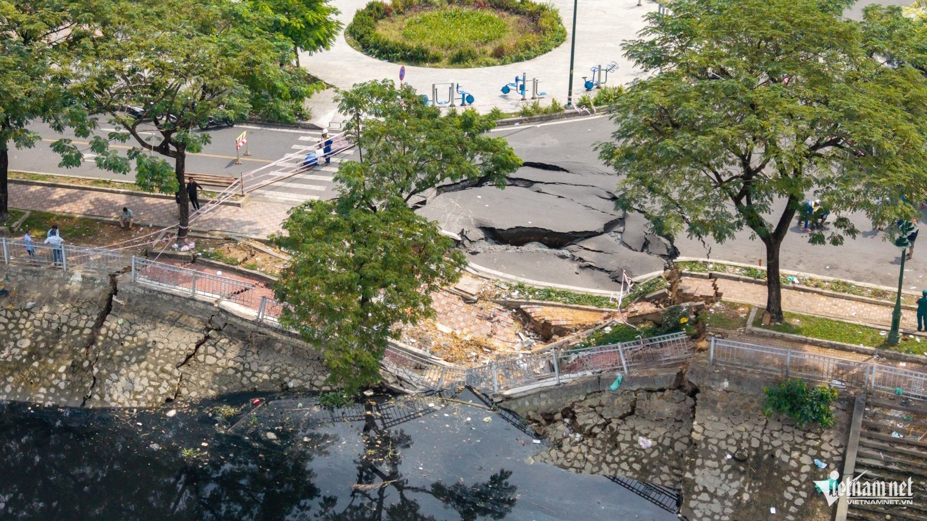 Theo ghi nhận tại hiện trường, hệ thống lan can sắt ven kênh bị kéo sập, uốn cong và biến dạng. Nhiều cây xanh bị bật gốc, nghiêng ngả, tiềm ẩn nguy cơ mất an toàn nghiêm trọng. Đặc biệt, trên đường Ba Đình, một mảng nhựa đường rộng khoảng 30m² bị sụt lún sâu hơn 50cm, tạo thành “hố tử thần” với các vết nứt toác kéo dài vào lòng đường.