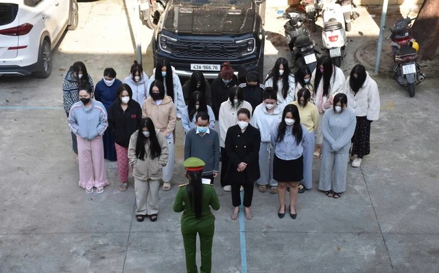 Hơn 40 đối tượng liên quan đến hoạt động mại dâm tại hai cơ sở được đưa về trụ sở cơ quan công an làm việc. (Ảnh: Công an TP Đà Nẵng)