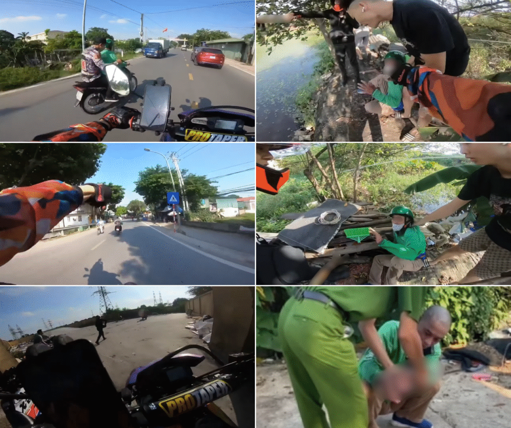 Sự việc nhanh chóng được một nhóm thanh niên phượt phát hiện. Ngay lập tức, họ truy đuổi gắt gao qua nhiều tuyến phố, tạo nên màn rượt đuổi nghẹt thở. Sau một quãng đường dài, nhóm phượt thủ đã đuổi kịp và khống chế được nam thanh niên mặc áo Grab, trong khi đối tượng còn lại nhảy khỏi xe và bỏ trốn.