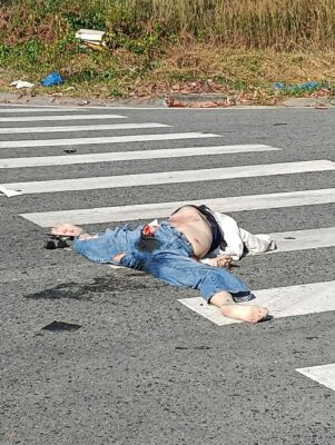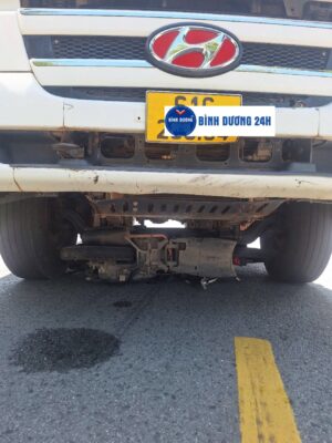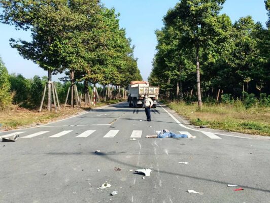 Xe ben chạy cuốn xe máy dưới gầm, thắng trượt 1 đoạn dài mới dừng lại.
