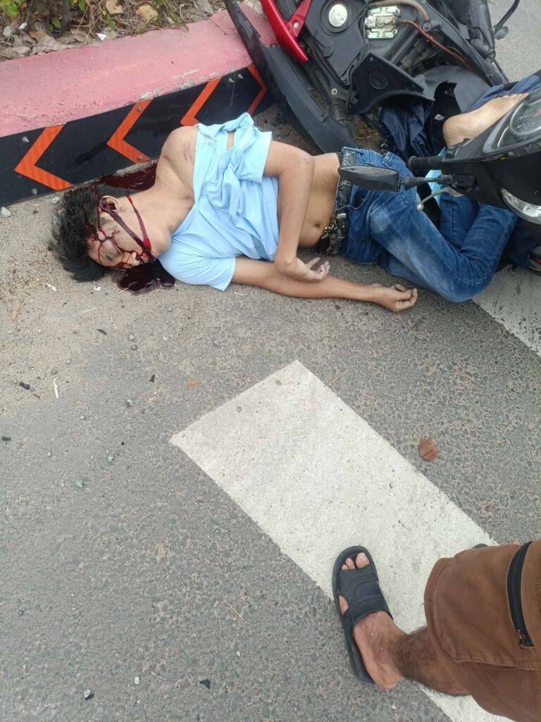 Tại hiện trường, thi thể nạn nhân tử vong và xe máy nằm sát dải phân cách trên đường Mỹ Phước – Tân Vạn. Xe máy của anh N.V.T văng về phía trước gần 10m.