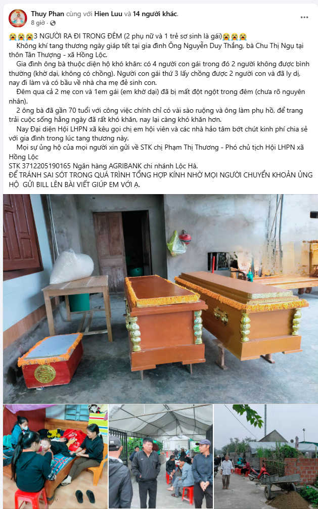 Sáng 6-2, không khí tang thương bao trùm gia đình ông Nguyễn Duy Thắng và bà Chu Thị Ngụ, trú tại thôn Tân Thượng, xã Hồng Lộc, tỉnh Hà Tĩnh, khi trong gia đình xảy ra vụ việc đặc biệt đau lòng khiến hai chị em ruột và một cháu bé sơ sinh tử vong, nghi do ngạt khí than.