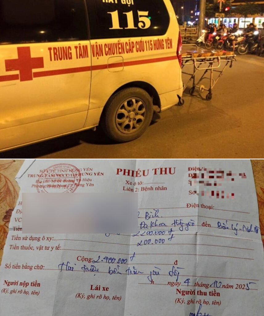 Phiếu thu cước vận chuyển của Trung tâm cấp cứu 115 Hưng Yên với tổng số tiền 2,4 triệu đồng cho quãng đường 12km. Ảnh: Nhân vật cung cấp