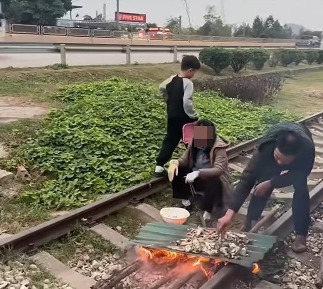 Sáng ngày 3/1, mạng xã hội chia sẻ đoạn clip ghi lại cảnh 1 nam, 1 nữ đang nướng đồ ăn tại khu vực đường ray tàu hỏa, bên cạnh đó 1 đứa trẻ cũng thoải mái chạy xung quanh đường tàu.