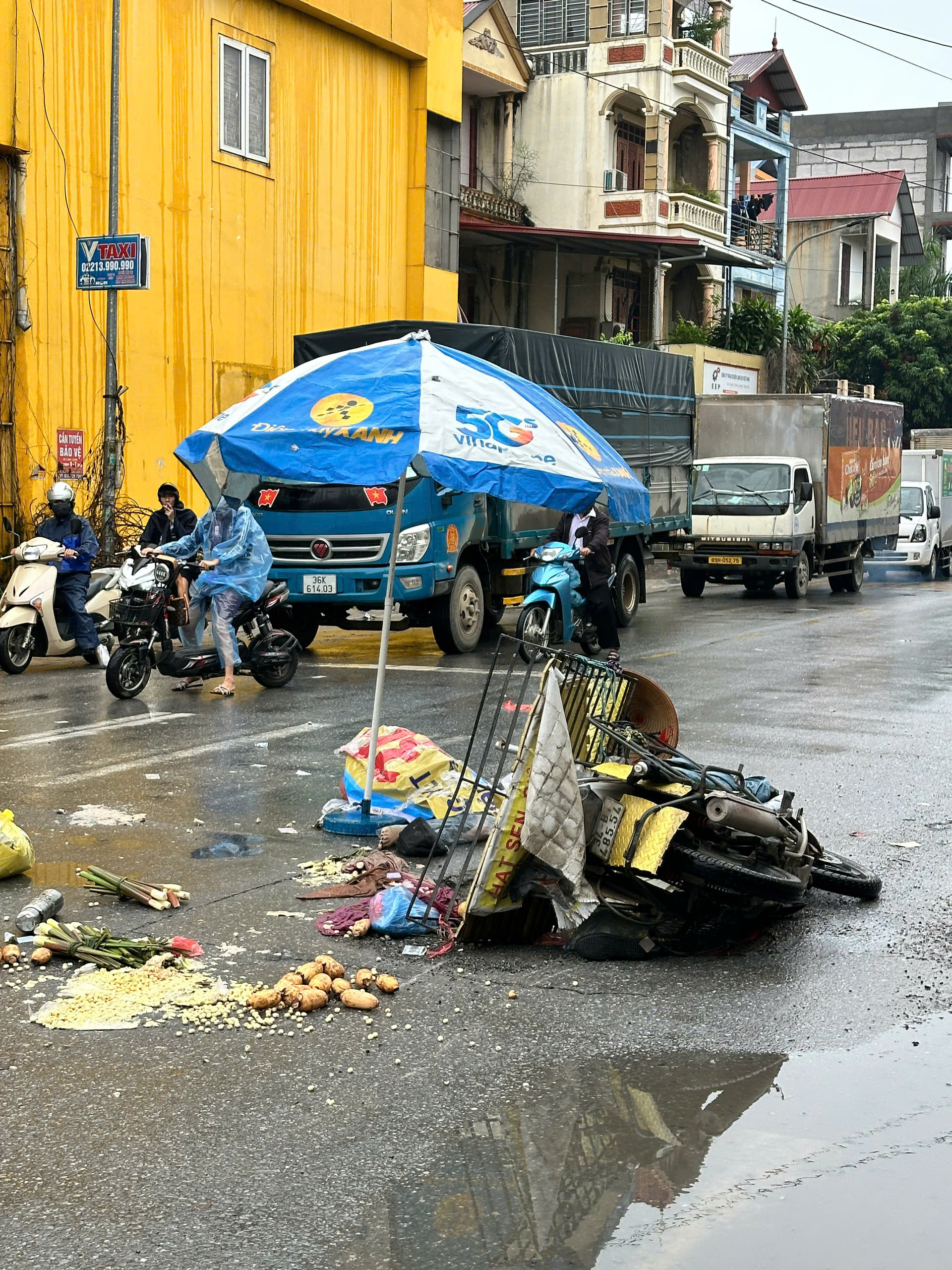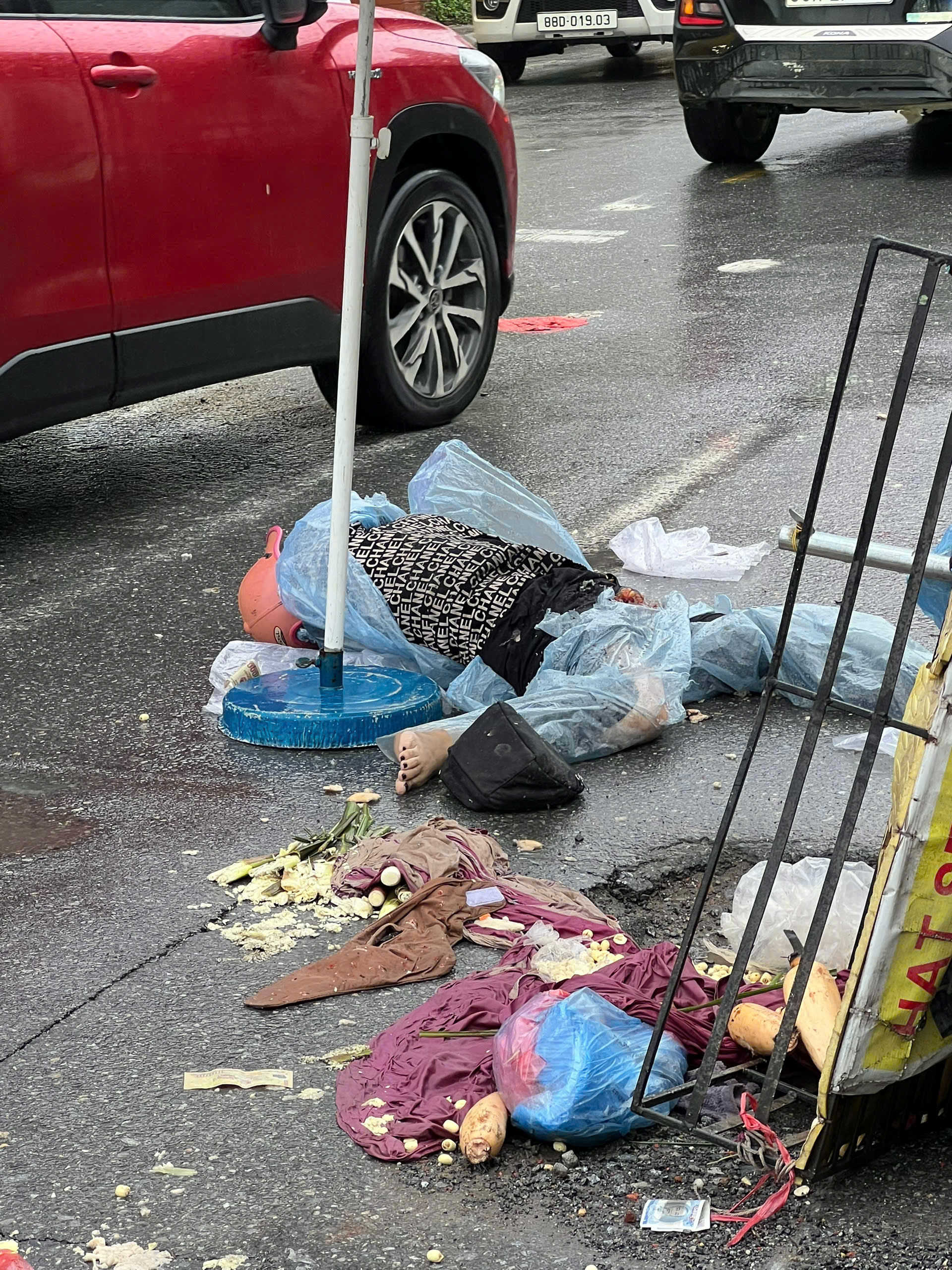 Cú va chạm mạnh khiến người phụ nữ ngã xuống đường, tử vong tại chỗ, nhiều rau củ, nông sản vương vãi khắp mặt đường. Chiếc xe máy và hàng hóa nằm ngổn ngang bên cạnh thi thể khiến nhiều người đi đường không khỏi xót xa và nghẹn lòng.