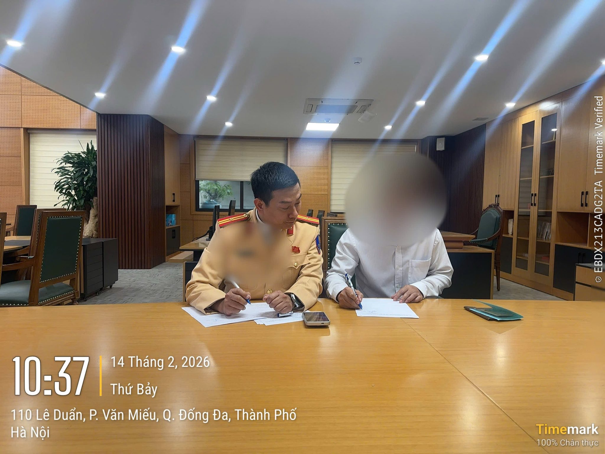 Ngày 14-2-2026, anh N.T.T đã đến trụ sở Cục Cảnh sát giao thông để làm việc. Tại đây, cán bộ CSGT đã lập biên bản làm việc, đồng thời lập biên bản vi phạm hành chính đối với hành vi điều khiển xe 80A062.xx gắn biển số bị che lấp.